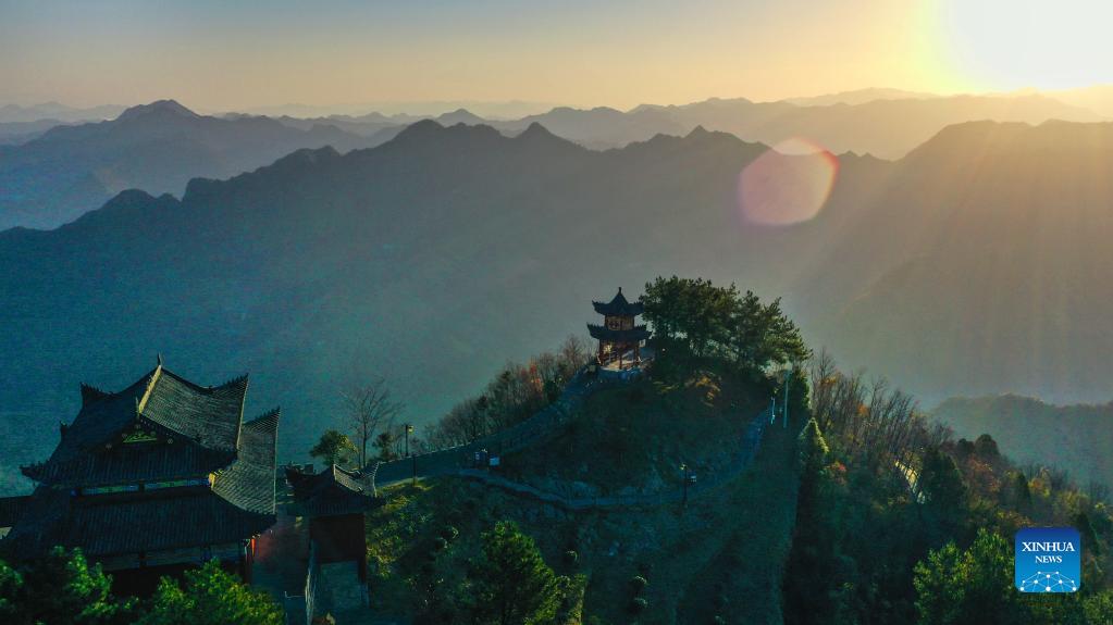 Aerial photo taken Nov. 23, 2021 shows the scenery of Miaoshanzhai scenic area in Baihe County, northwest China's Shaanxi Province. (Xinhua/Tao Ming)