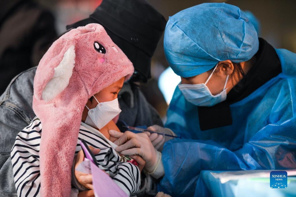 A kid receives a dose of COVID-19 vaccine at a school in Hohhot, north China's Inner Mongolia Autonomous Region, Nov. 23, 2021. Hohhot recently launched a COVID-19 vaccination campaign for children aged 3 to 11. (Xinhua/Peng Yuan)