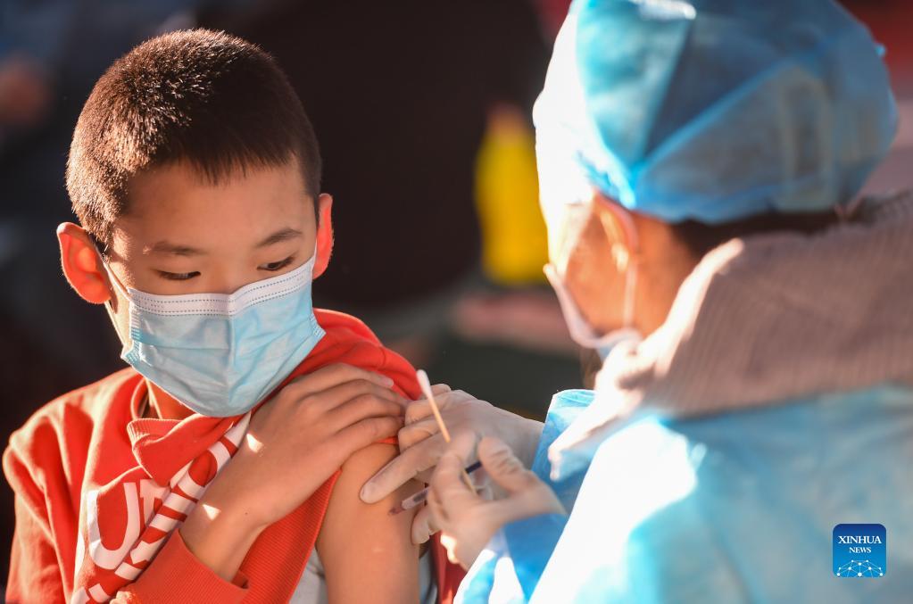 A kid receives a dose of COVID-19 vaccine at a school in Hohhot, north China's Inner Mongolia Autonomous Region, Nov. 23, 2021. Hohhot recently launched a COVID-19 vaccination campaign for children aged 3 to 11. (Xinhua/Peng Yuan)