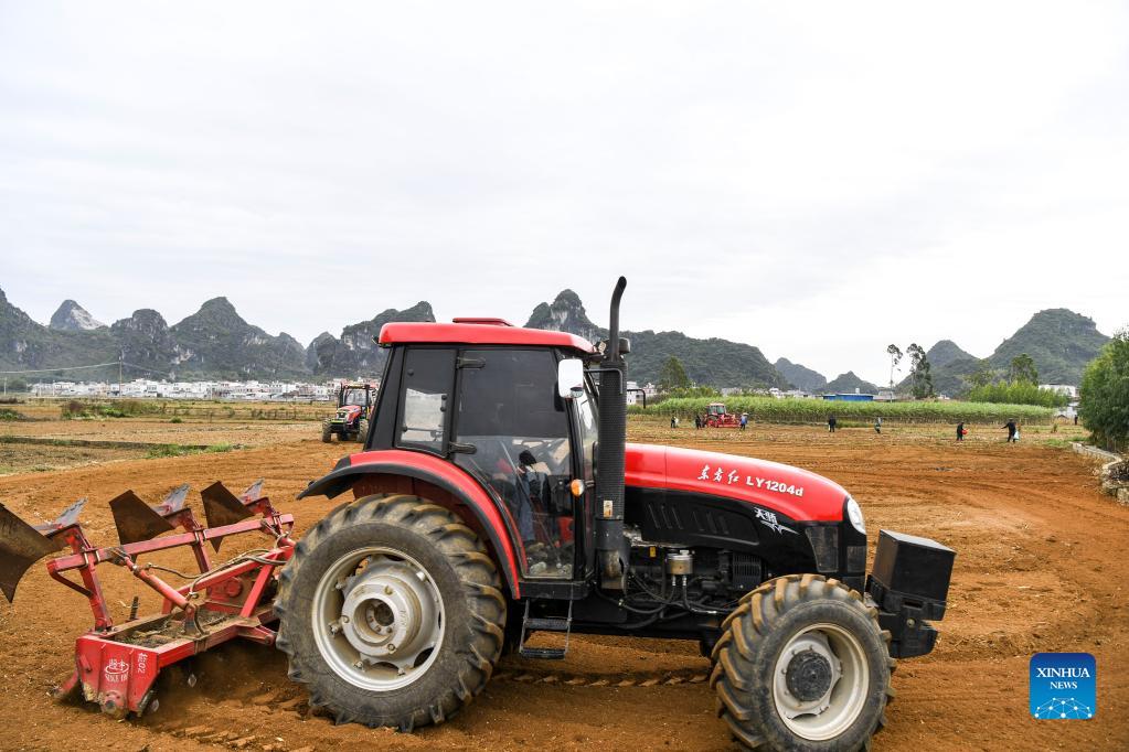 An agricultural machinery plows in the fields during the winter planting season at Diyou Village of Wuxuan County, south China's Guangxi Zhuang Autonomous Region, Nov. 23, 2021. (Xinhua/Cao Yiming)