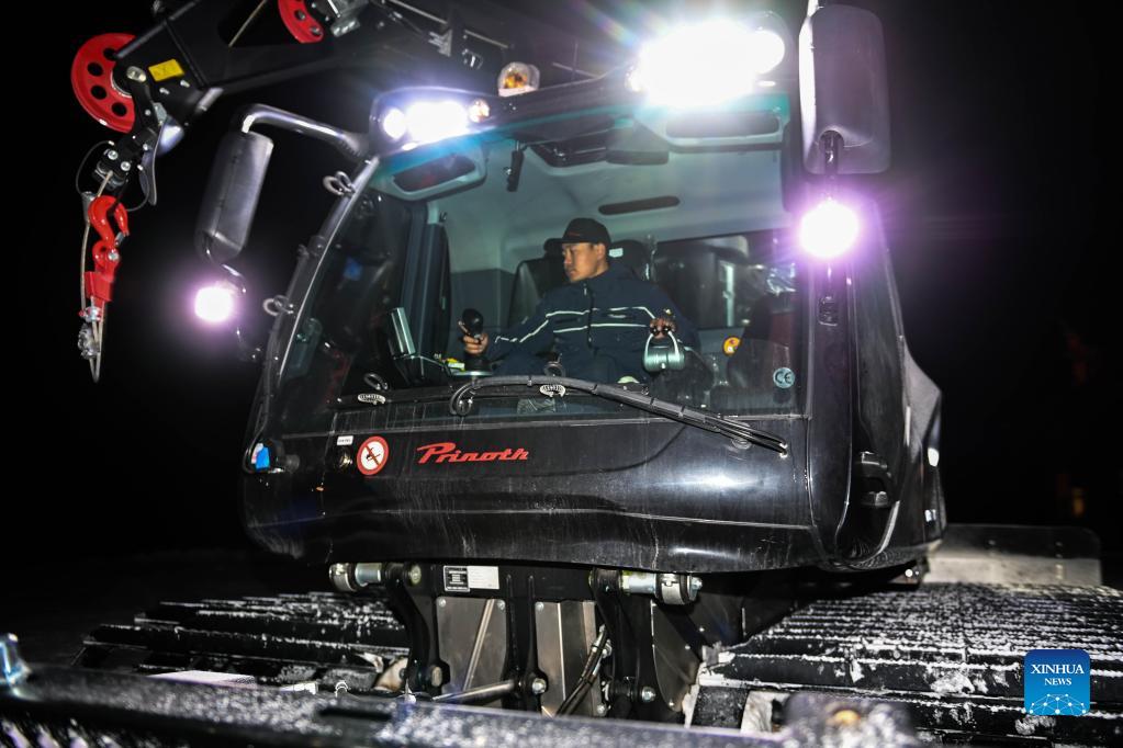 Gao Wenbin drives a groomer at Changbai Mountain Ski Resort in northeast China's Jilin Province, Nov. 19, 2021. At Changbai Mountains Ski Resort, snow-making professionals as snow cannon operators, groomer drivers and snow track patrols work in cold nights in order to secure high quality of snow for visitors. As the 2022 Beijing Olympics approaches and the Chinese government encourages 300 million people to be involved in winter sports, ski resorts in China are seeing increasing visitors and providing more diversed job opportunities. (Xinhua/Yan Linyun)