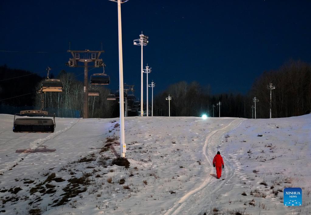A worker patrols the snow track at Changbai Mountain Ski Resort in northeast China's Jilin Province, Nov. 19, 2021. At Changbai Mountains Ski Resort, snow-making professionals as snow cannon operators, groomer drivers and snow track patrols work in cold nights in order to secure high quality of snow for visitors. As the 2022 Beijing Olympics approaches and the Chinese government encourages 300 million people to be involved in winter sports, ski resorts in China are seeing increasing visitors and providing more diversed job opportunities. (Xinhua/Xu Chang)