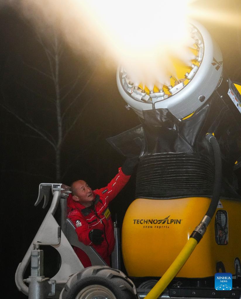 Sun Desheng checks the snowmaking machine at Changbai Mountain Ski Resort in northeast China's Jilin Province, Nov. 19, 2021. At Changbai Mountains Ski Resort, snow-making professionals as snow cannon operators, groomer drivers and snow track patrols work in cold nights in order to secure high quality of snow for visitors. As the 2022 Beijing Olympics approaches and the Chinese government encourages 300 million people to be involved in winter sports, ski resorts in China are seeing increasing visitors and providing more diversed job opportunities. (Xinhua/Xu Chang)