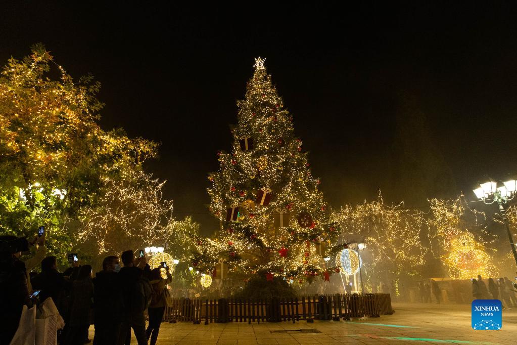 People take photos of illuminated trees with decorative lights in Syntagma Square in Athens, Greece, on Nov. 23, 2021. The festive season kicked off in Athens on Tuesday evening. (Xinhua/Marios Lolos)