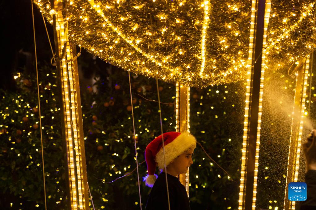 A child is seen with decorative lights in Syntagma Square in Athens, Greece, on Nov. 23, 2021. The festive season kicked off in Athens on Tuesday evening. (Xinhua/Marios Lolos)