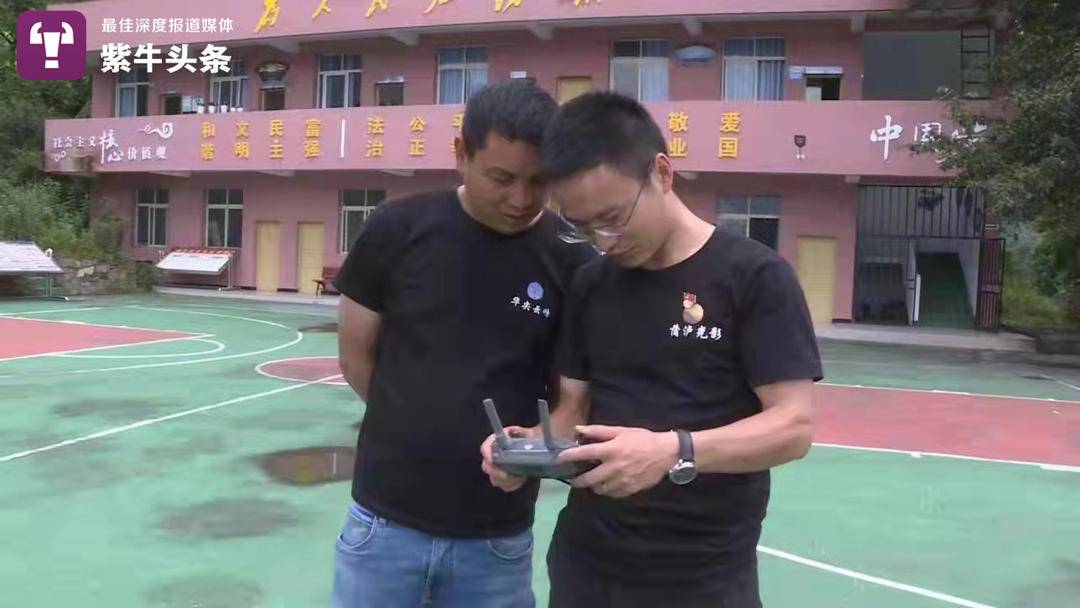 Ren Xianqiao (R) and Yuan Xiaobo operate a drone to film the scenery in the village. (yangtse.com/ Photo courtesy of the interviewees)