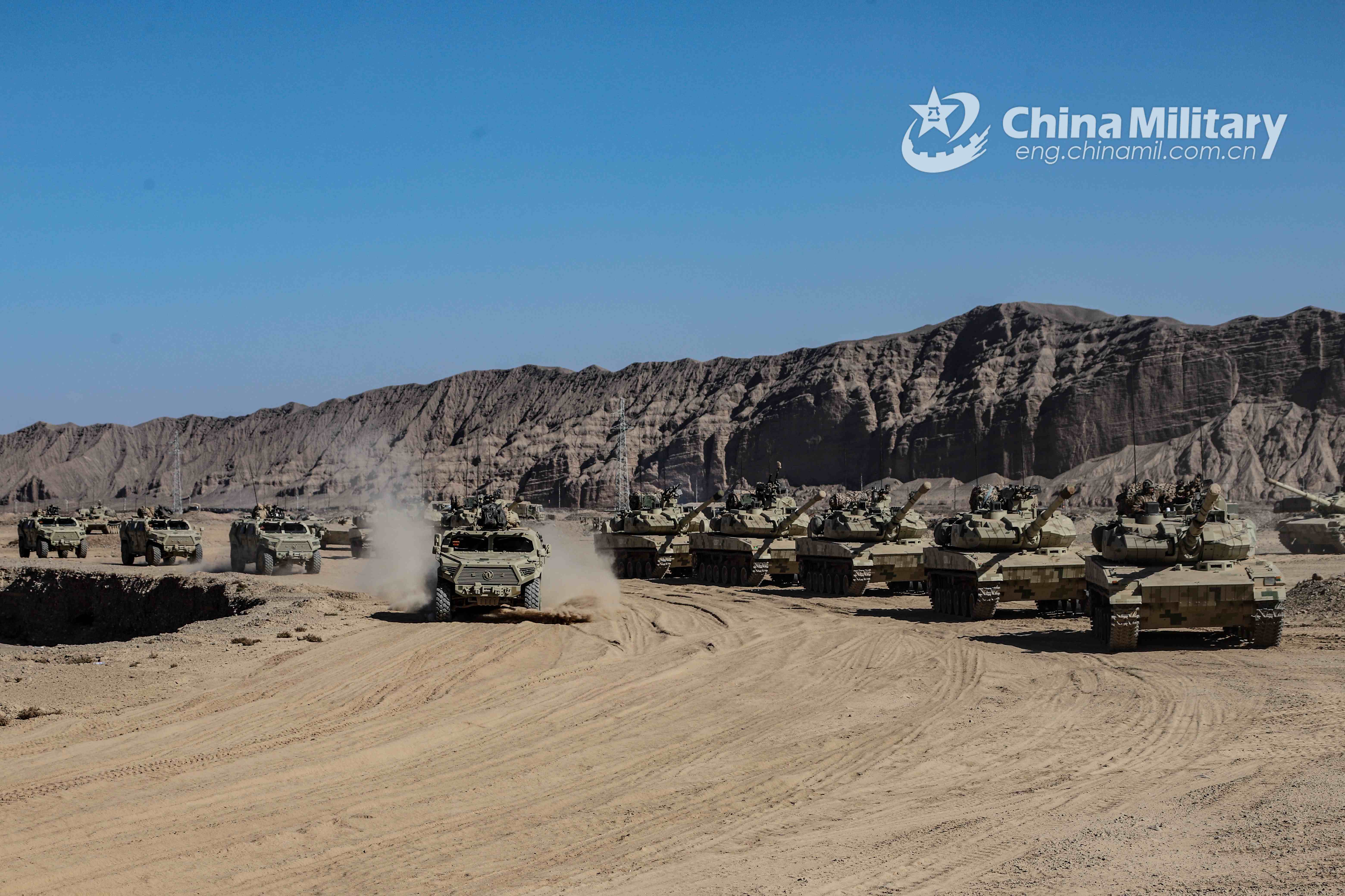 Multi types of armored vehicles attached to a combined arms regiment under the PLA Nanjiang Military Command rumble in formation to a designated training field for a live-fire training exercise in late October, 2021. (eng.chinamil.com.cn/Photo by Kong Lingzhi and Li Jinqiao)