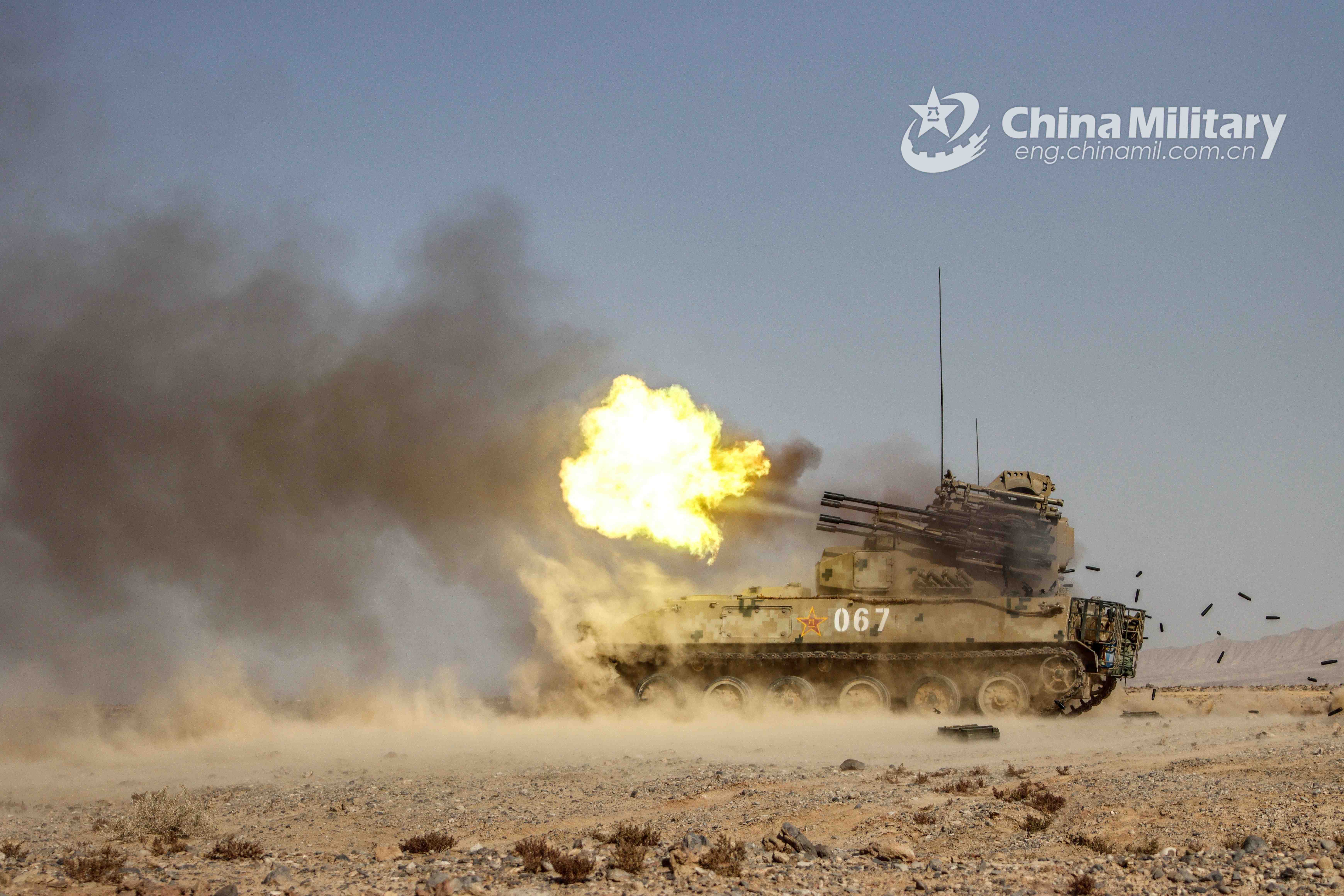 A 25mm self-propelled anti-aircraft gun attached to a combined arms regiment under the PLA Nanjiang Military Command fires at mock aerial target during a live-fire training exercise in late October, 2021. (eng.chinamil.com.cn/Photo by Kong Lingzhi and Li Jinqiao)
