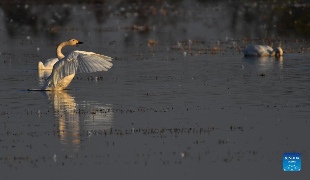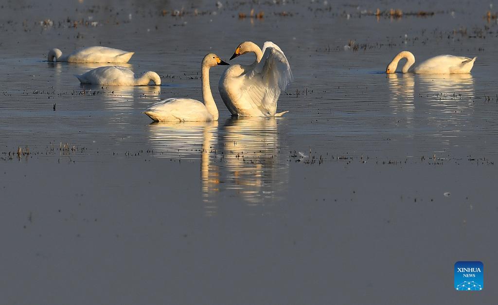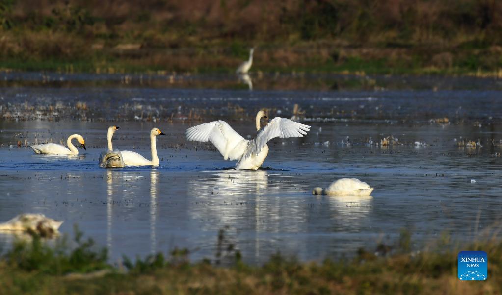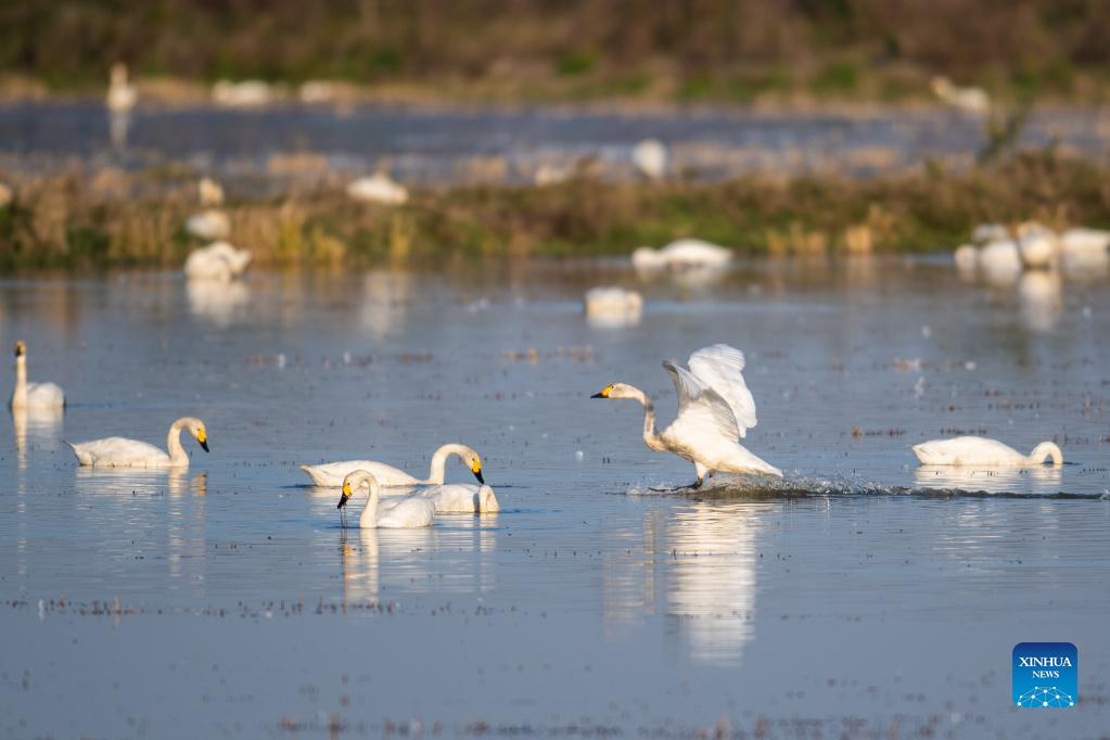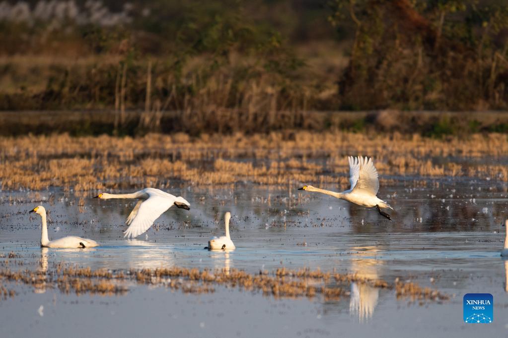 Little swans are seen at the Donggu Lake wetland of the Quyuan administration area in Yueyang City, central China's Hunan Province, Nov. 24, 2021. About 3,000 little swans have arrived at the Donggu Lake wetland of the Quyuan administration area in Yueyang for wintering. (Xinhua/Zhao Zhongzhi)