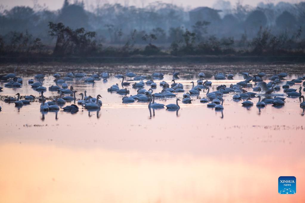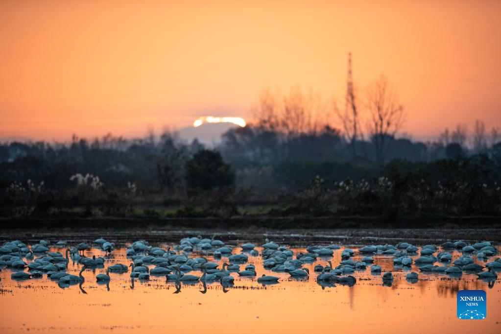 A flock of little swans fly at dawn in the Quyuan administration area in Yueyang City, central China's Hunan Province, Nov. 24, 2021. About 3,000 little swans have arrived at the Donggu Lake wetland of the Quyuan administration area in Yueyang for wintering. (Xinhua/Zhao Zhongzhi)