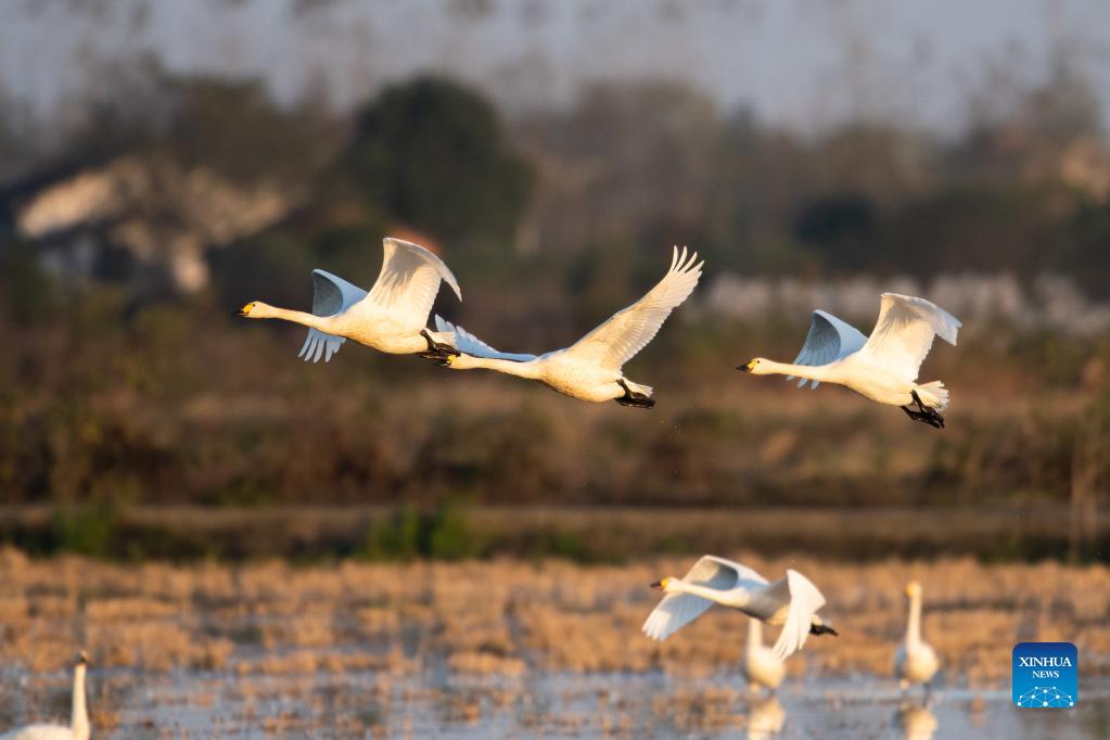 Little swans fly in the sky at the Donggu Lake wetland of the Quyuan administration area in Yueyang City, central China's Hunan Province, Nov. 23, 2021. About 3,000 little swans have arrived at the Donggu Lake wetland of the Quyuan administration area in Yueyang for wintering. (Xinhua/Zhao Zhongzhi)