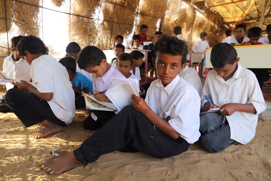 Students study inside a classroom made from straw at a primary school in Hajjah province, northern Yemen, Nov. 24, 2021. (Photo by Mohammed Al-Wafi/Xinhua)