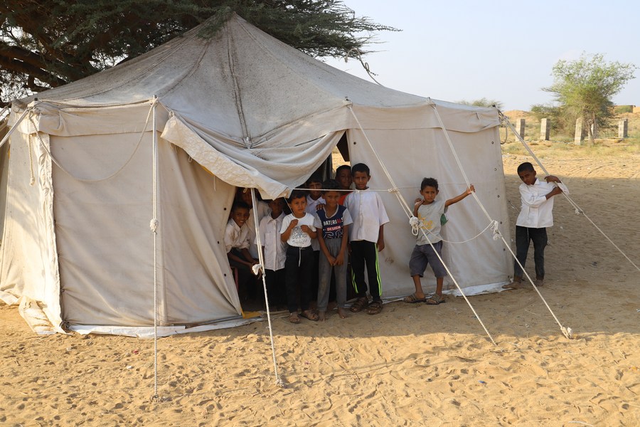 Students stand in front of a tent that serves as their classroom at a primary school in Hajjah province, northern Yemen, Nov. 24, 2021. (Photo by Mohammed Al-Wafi/Xinhua)