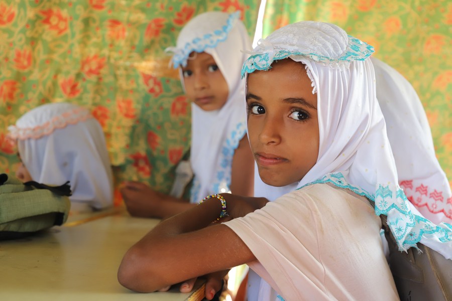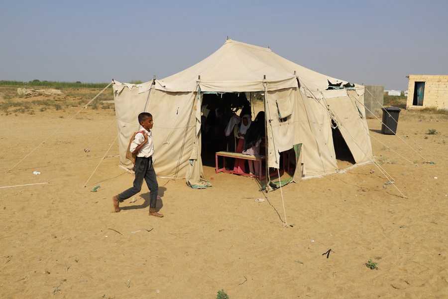 A student walks past a tent that serves as a classroom at a primary school in Hajjah province, northern Yemen, Nov. 24, 2021. (Photo by Mohammed Al-Wafi/Xinhua)