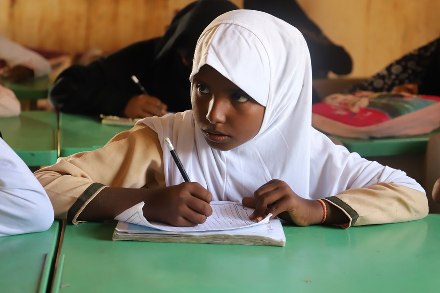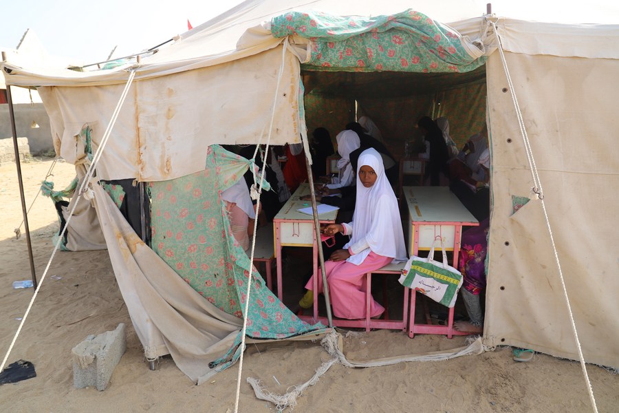 Students study inside a tent that serves as their classroom at a primary school in Hajjah province, northern Yemen, Nov. 24, 2021. (Photo by Mohammed Al-Wafi/Xinhua)