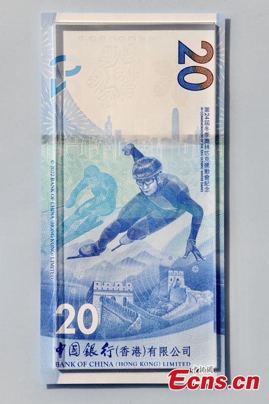 Straight design with an athlete on competition on the reverse side of the commemorative banknote for Beijing 2022 Winter Olympics is unveiled in Hong Kong, Nov. 24, 2021. (Photo: China News Service/Li Zhihua)