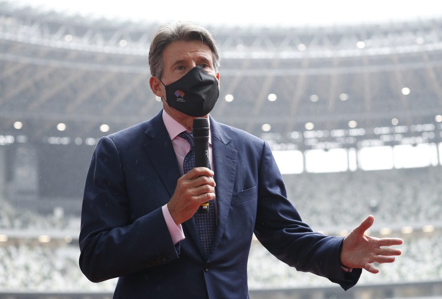 World Athletics President Sebastian Coe wearing a protective face mask speaks to media as he inspects the National Stadium, the main stadium of Tokyo 2020 Olympics and Paralympics, in Tokyo, Japan, Oct. 8, 2020. (Issei Kato/Pool via Xinhua)