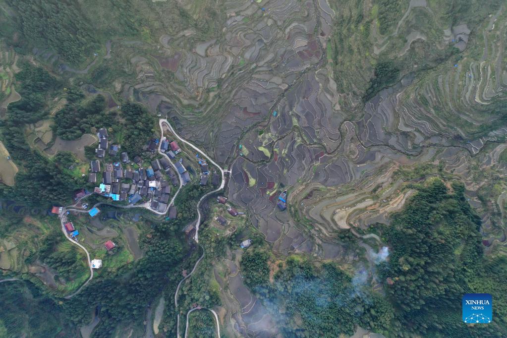 Aerial photo taken on Nov. 25, 2021 shows the winter scenery of Baixiu Village in Gandong Township of Rongshui Miao Autonomous County, south China's Guangxi Zhuang Autonomous Region. (Xinhua/Huang Xiaobang)