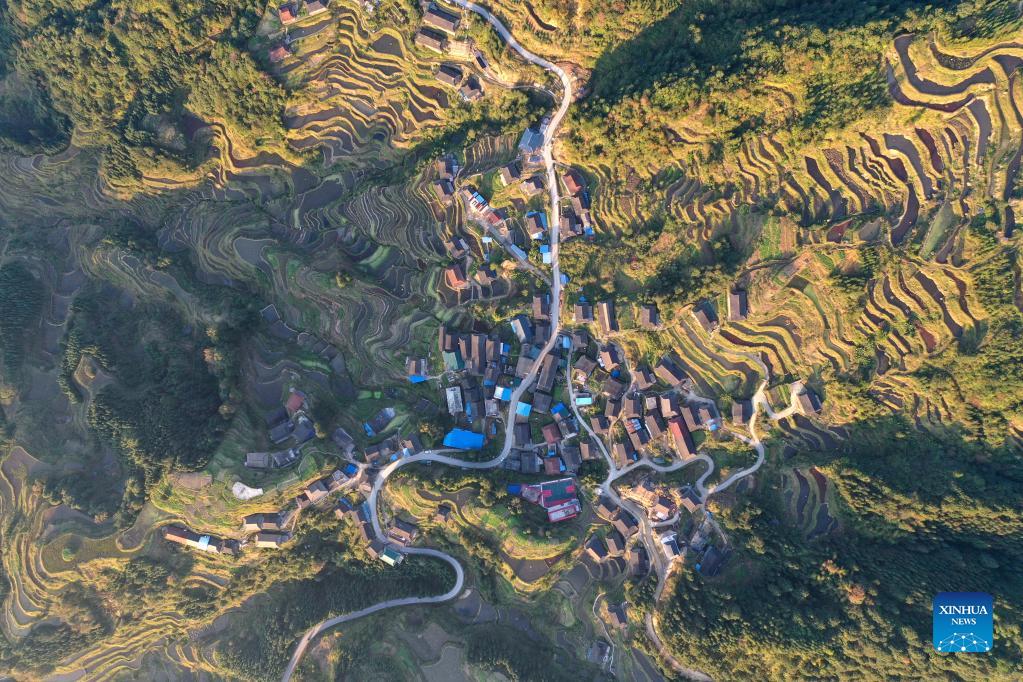 Aerial photo taken on Nov. 25, 2021 shows the winter scenery of Dangjiu Village in Gandong Township of Rongshui Miao Autonomous County, south China's Guangxi Zhuang Autonomous Region. (Xinhua/Huang Xiaobang)
