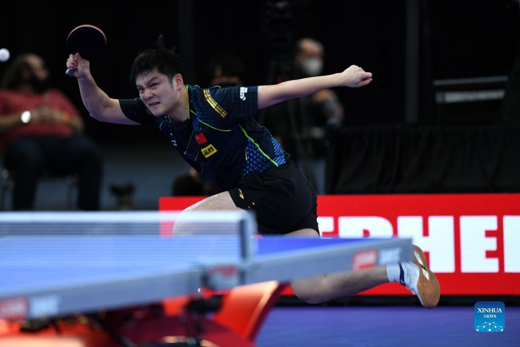 Fan Zhendong of China competes during the men's singles round of 64 match against Amir Hossein Hodaei of Iran at 2021 World Table Tennis Championships Finals in Houston, the United States on Nov. 24, 2021. (Xinhua/Wu Xiaoling)