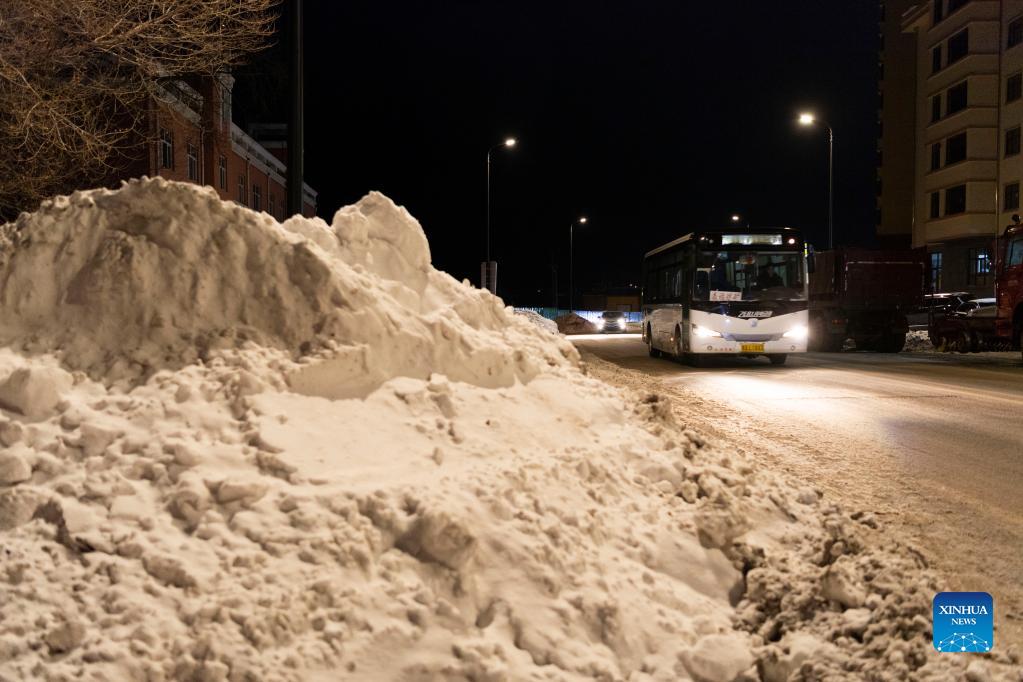 Photo taken on Nov. 24, 2021 shows a snowbank on the side of the road in Hegang City, northeast China's Heilongjiang Province. (Xinhua/Xie Jianfei)