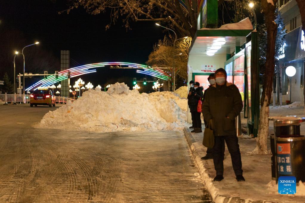 Residents wait for bus after the snow is cleared in Hegang City, northeast China's Heilongjiang Province, Nov. 24, 2021. (Xinhua/Xie Jianfei)