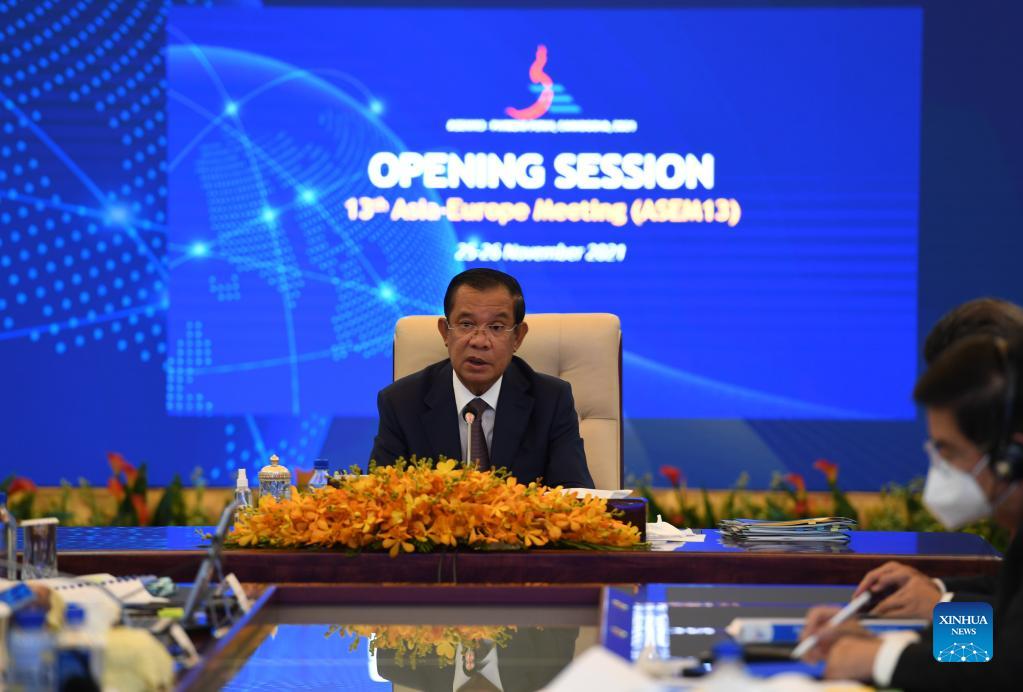 Cambodian Prime Minister Samdech Techo Hun Sen speaks during the opening ceremony of the 13th Asia-Europe Meeting (ASEM) Summit via video link in Phnom Penh, Cambodia on Nov. 25, 2021. (Xinhua)