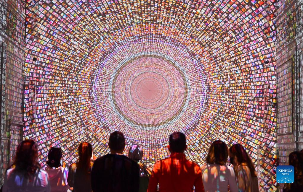 People visit a digital art exhibition at a movie theater in Istanbul, Turkey, on Nov. 24, 2021. A digital art exhibition, created by using artificial intelligence (AI), fascinates art lovers at a newly renovated ancient movie theater in Istanbul. (Xinhua/Sadat)