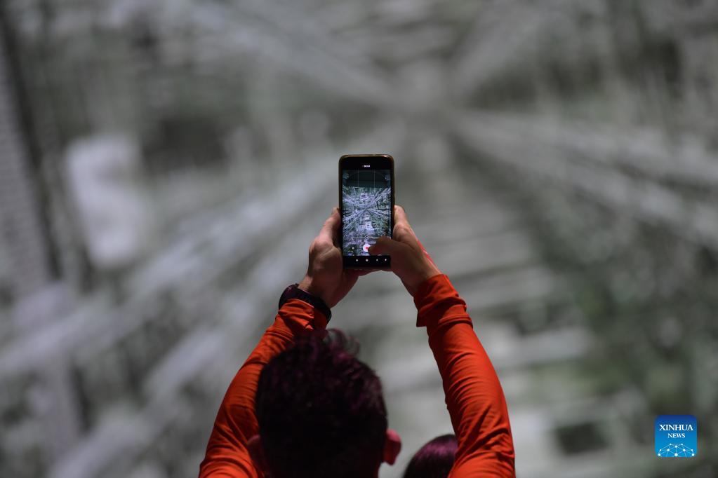 A visitor takes photos at a digital art exhibition at a movie theater in Istanbul, Turkey, on Nov. 24, 2021. A digital art exhibition, created by using artificial intelligence (AI), fascinates art lovers at a newly renovated ancient movie theater in Istanbul. (Xinhua/Sadat)