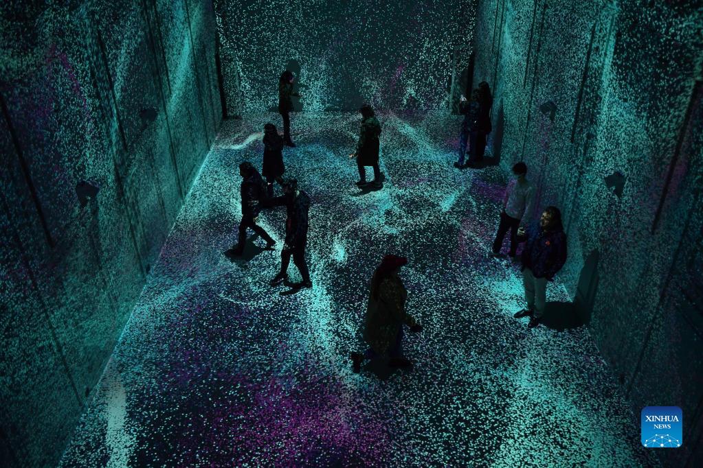People visit a digital art exhibition at a movie theater in Istanbul, Turkey, on Nov. 24, 2021. A digital art exhibition, created by using artificial intelligence (AI), fascinates art lovers at a newly renovated ancient movie theater in Istanbul. (Xinhua/Sadat)