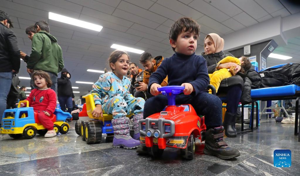 Stranded Iraqi migrants wait to return to Iraq at Minsk's International Airport in Minsk, Belarus, Nov. 25, 2021. The Iraqi Foreign Ministry said Thursday that it has evacuated 617 migrants stranded in Belarus, most of whom are women, children and the elderly. Thousands of migrants have been gathering on the Belarusian side of the border with Poland, in an attempt to enter Poland and then Germany to seek asylum in European countries. (Photo by Henadz Zhinkov/Xinhua)