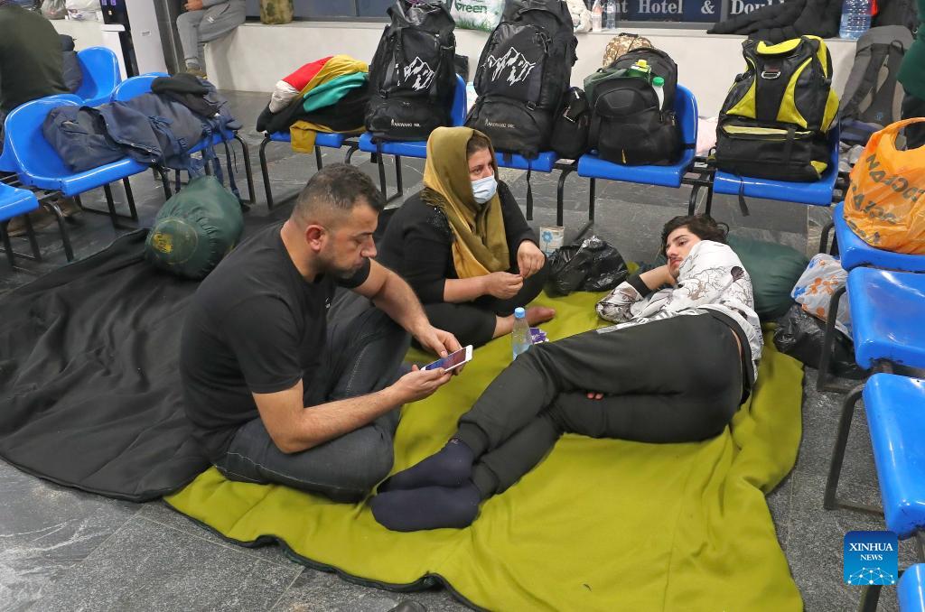 Stranded Iraqi migrants wait to return to Iraq at Minsk's International Airport in Minsk, Belarus, Nov. 25, 2021. The Iraqi Foreign Ministry said Thursday that it has evacuated 617 migrants stranded in Belarus, most of whom are women, children and the elderly. Thousands of migrants have been gathering on the Belarusian side of the border with Poland, in an attempt to enter Poland and then Germany to seek asylum in European countries. (Photo by Henadz Zhinkov/Xinhua)