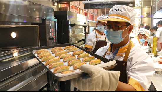 A staff member of Daoxiangcun, a time-honored food brand, takes freshly baked pastries out of an oven at the brand’s new store situated at its original founding address. (Photo courtesy of the interviewee)
