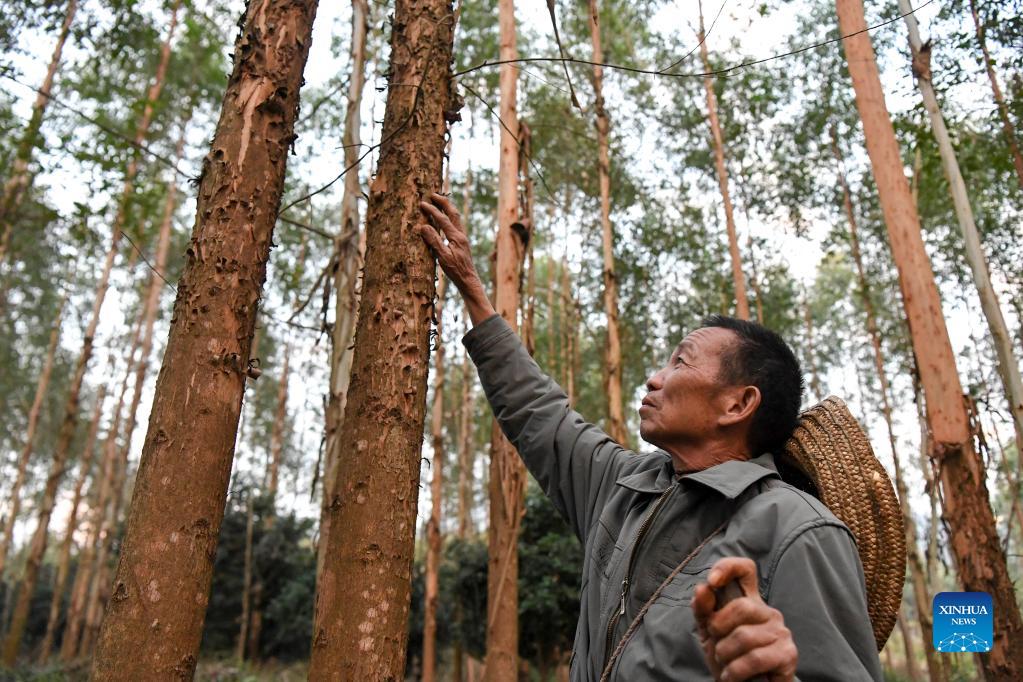 Lei Qiyuan patrols the forest area in Dongxiang Town of Wuxuan County, south China's Guangxi Zhuang Autonomous Region, Nov. 24, 2021. Lei Qiyuan, 66, has been engaged in forest protection for 17 years. Working at an altitude of over 1,400 meters above sea level, Lei is in charge of an area of 5,800 mu (about 386.7 hectares). Lei, trekking several hours every day in patrols, shoulders the responsibility of keeping the forests safe from fire and illegal cutting-down. (Xinhua/Cao Yiming)