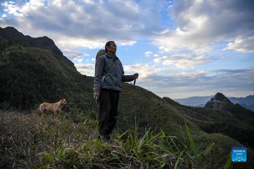 Lei Qiyuan stands during a forest patrol in Dongxiang Town of Wuxuan County, south China's Guangxi Zhuang Autonomous Region, Nov. 24, 2021. Lei Qiyuan, 66, has been engaged in forest protection for 17 years. Working at an altitude of over 1,400 meters above sea level, Lei is in charge of an area of 5,800 mu (about 386.7 hectares). Lei, trekking several hours every day in patrols, shoulders the responsibility of keeping the forests safe from fire and illegal cutting-down. (Xinhua/Cao Yiming)