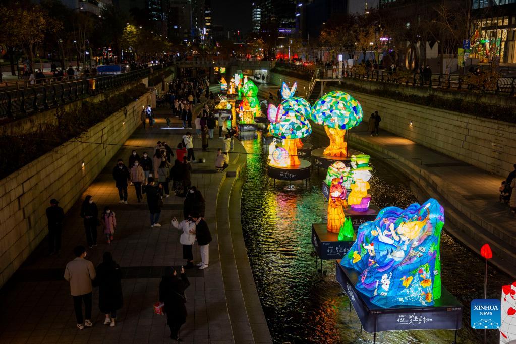 People view lanterns during the 2021 Seoul Lantern Festival in Seoul, South Korea, Nov. 26, 2021. (Xinhua/Wang Yiliang)