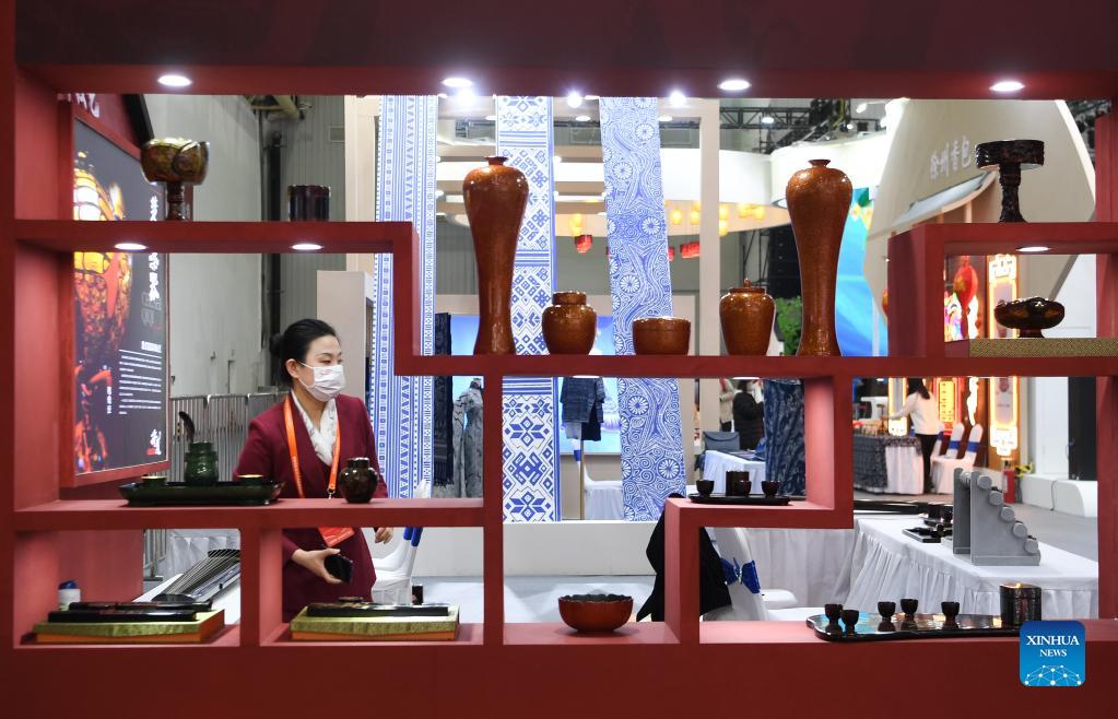 A staff member works at the China (Wuhan) Culture and Tourism Expo in Wuhan, central China's Hubei Province, Nov. 26, 2021. The first China (Wuhan) Culture and Tourism Expo kicked off Friday in Wuhan, capital of central China's Hubei Province. Themed "Beautiful China, Happy Life," the three-day event has attracted industry and government representatives from 29 domestic provincial-level regions, 13 foreign countries and two international organizations, according to the organizers. (Xinhua/Cheng Min)