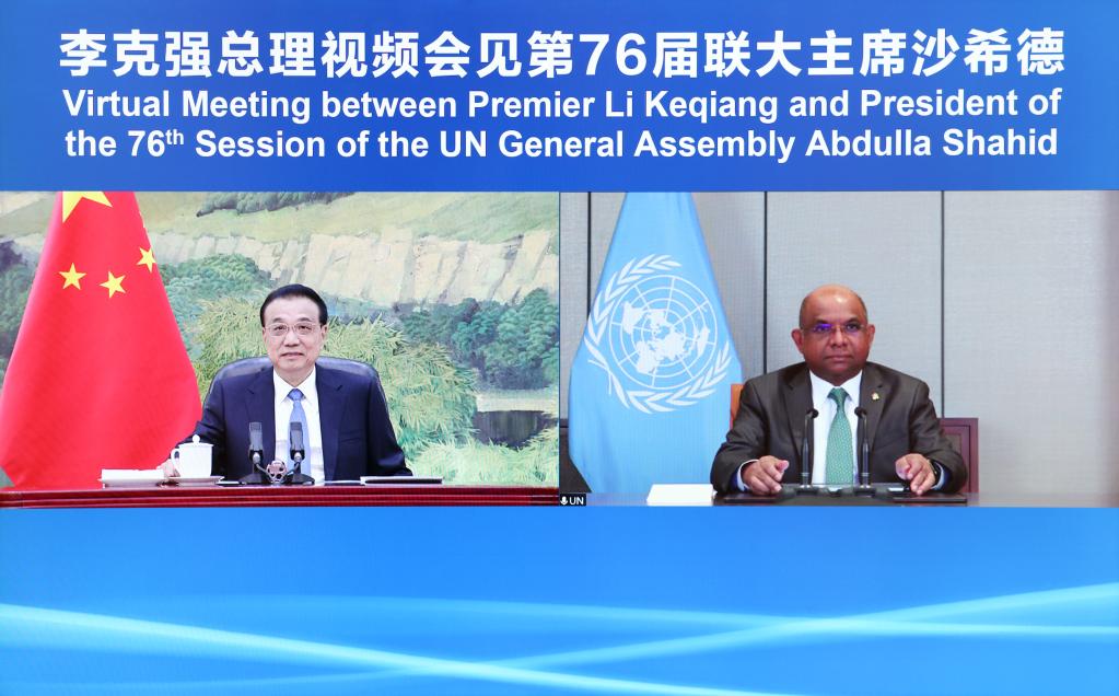 Chinese Premier Li Keqiang meets with Abdulla Shahid, president of the 76th session of the United Nations General Assembly (UNGA), via video link at the Great Hall of the People in Beijing, capital of China, Nov. 26, 2021. (Xinhua/Liu Bin)