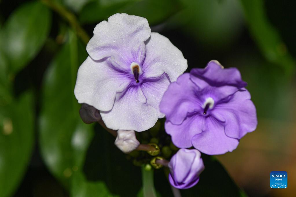 Photo taken on Nov. 16, 2021 shows the Brunfelsia brasiliensis in Hainan Tropical Botanical Garden in Danzhou City, south China's Hainan Province. Hainan Tropical Botanical Garden, located in Danzhou of south China's Hainan, was founded in 1958 and is now affiliated with Chinese Academy of Tropical Agricultural Sciences. The garden, with over 2,600 kinds of tropical and subtropical plants collected from more than 40 countries and regions, is a treasure house of tropical plant resources including flowers, fruit trees, medicinal plants and economic plants, etc. (Xinhua/Pu Xiaoxu)