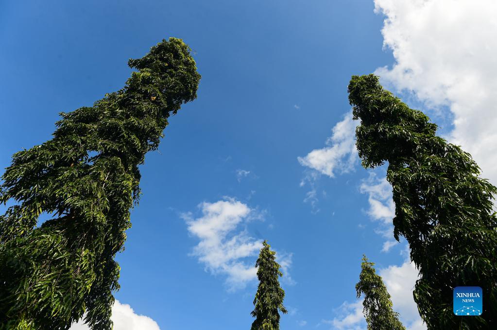 Photo taken on Nov. 16, 2021 shows the Polyalthia longifolia in Hainan Tropical Botanical Garden in Danzhou City, south China's Hainan Province. Hainan Tropical Botanical Garden, located in Danzhou of south China's Hainan, was founded in 1958 and is now affiliated with Chinese Academy of Tropical Agricultural Sciences. The garden, with over 2,600 kinds of tropical and subtropical plants collected from more than 40 countries and regions, is a treasure house of tropical plant resources including flowers, fruit trees, medicinal plants and economic plants, etc. (Xinhua/Pu Xiaoxu)
