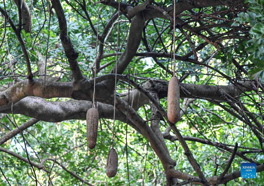 Photo taken on Nov. 16, 2021 shows the Kigelia africana (sausage tree) in Hainan Tropical Botanical Garden in Danzhou City, south China's Hainan Province. Hainan Tropical Botanical Garden, located in Danzhou of south China's Hainan, was founded in 1958 and is now affiliated with Chinese Academy of Tropical Agricultural Sciences. The garden, with over 2,600 kinds of tropical and subtropical plants collected from more than 40 countries and regions, is a treasure house of tropical plant resources including flowers, fruit trees, medicinal plants and economic plants, etc. (Xinhua/Pu Xiaoxu)