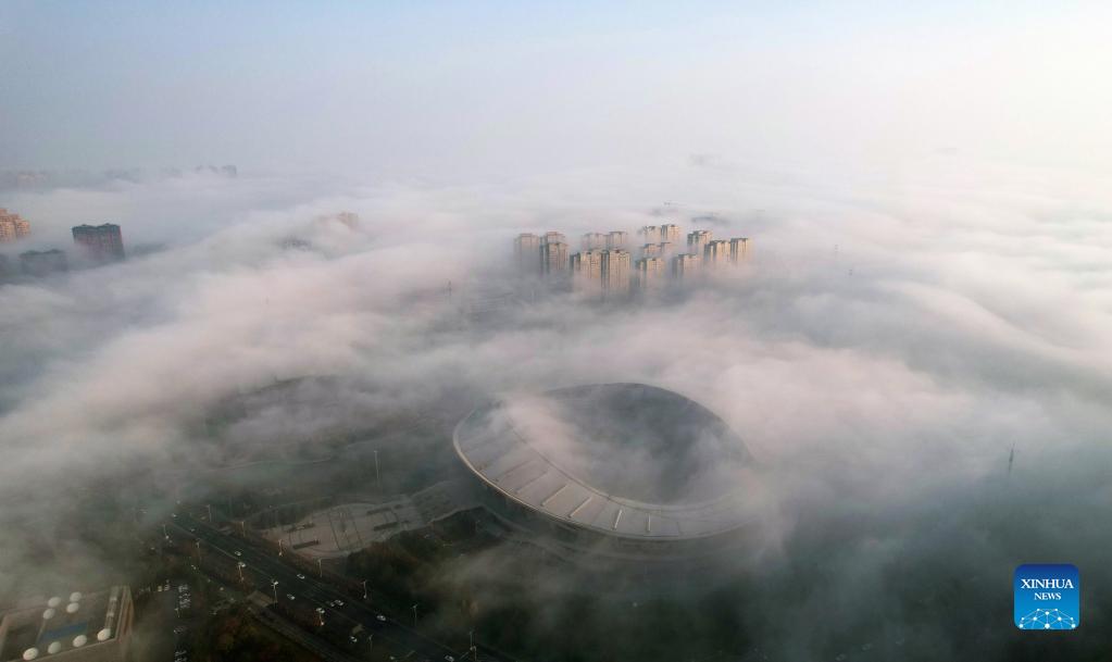 Aerial photo taken on Nov. 26, 2021 shows the city view amid mist in Rugao, east China's Jiangsu Province. (Photo by Qiu Yu/Xinhua)