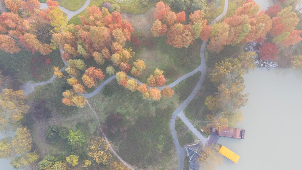 Aerial photo taken on Nov. 26, 2021 shows the Slender West Lake scenic spot amid morning mist in Yangzhou, east China's Jiangsu Province. (Photo by Qi Liguang/Xinhua)
