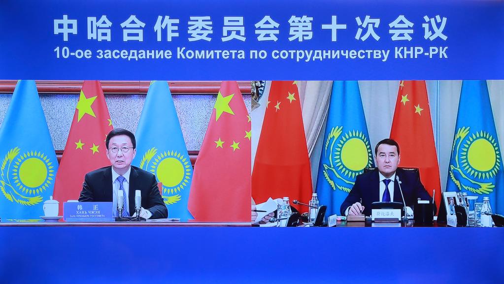 Chinese Vice Premier Han Zheng, also a member of the Standing Committee of the Political Bureau of the Communist Party of China Central Committee and Chinese president of the China-Kazakhstan Cooperation Committee, co-chairs the 10th meeting of the China-Kazakhstan Cooperation Committee with Alikhan Smailov, Kazakhstan's First Deputy Prime Minister and Kazakh president of the China-Kazakhstan Cooperation Committee, via video link in Beijing, capital of China, Nov. 26, 2021. (Xinhua/Ding Lin)