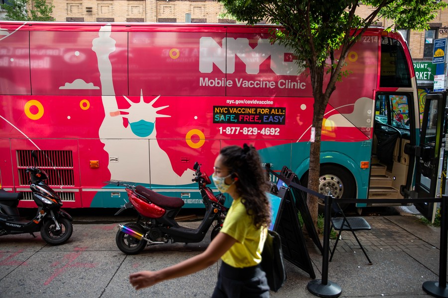 A pedestrian passes a mobile vaccine clinic in the Brooklyn borough of New York, United States, on Aug. 23, 2021. (Photo by Michael Nagle/Xinhua)