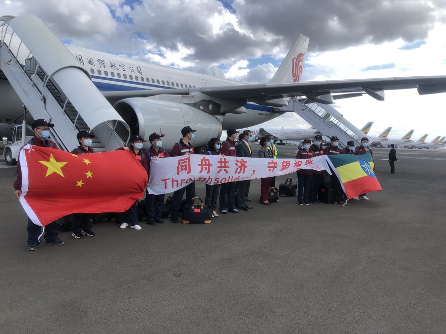 Members of a Chinese medical team pose for a photo upon their arrival at the airport in Addis Ababa, Ethiopia, April 16, 2020. (Xinhua/Wang Shoubao)