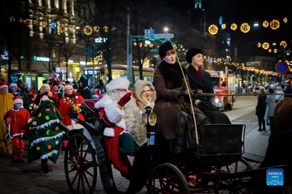 People take part in a parade during a traditional Christmas opening event in Helsinki, Finland, on Nov. 27, 2021. The Christmas opening event was held in central Helsinki on Saturday, marking the start of the festive season. (Photo by Matti Matikainen/Xinhua)