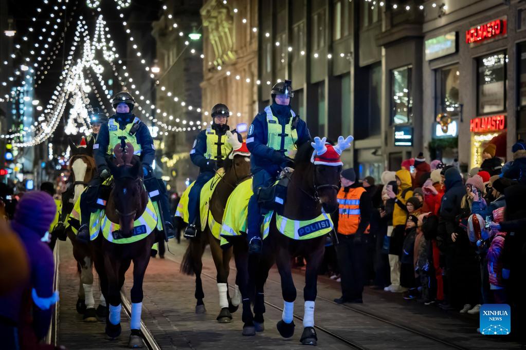 Mounted police are seen in a parade during a traditional Christmas opening event in Helsinki, Finland, on Nov. 27, 2021. The Christmas opening event was held in central Helsinki on Saturday, marking the start of the festive season. (Photo by Matti Matikainen/Xinhua)