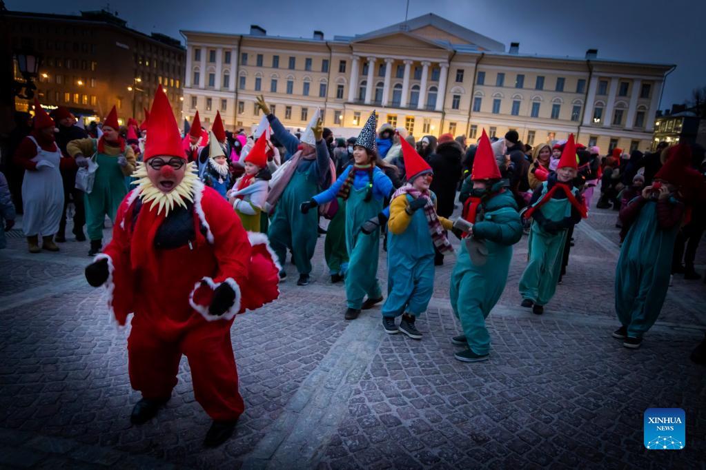 Performers are seen during a traditional Christmas opening event in Helsinki, Finland, on Nov. 27, 2021. The Christmas opening event was held in central Helsinki on Saturday, marking the start of the festive season. (Photo by Matti Matikainen/Xinhua)