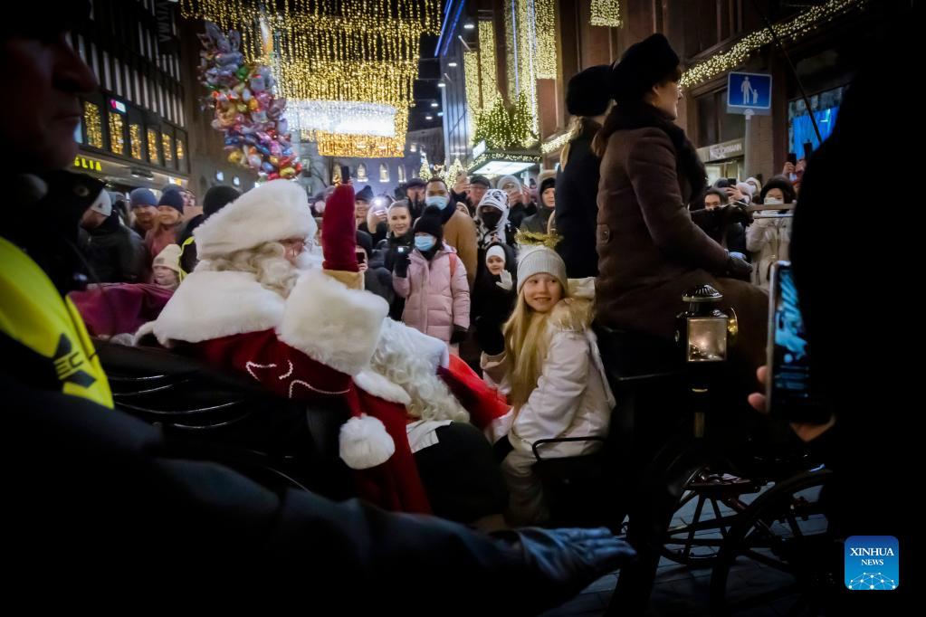 People take part in a parade during a traditional Christmas opening event in Helsinki, Finland, on Nov. 27, 2021. The Christmas opening event was held in central Helsinki on Saturday, marking the start of the festive season. (Photo by Matti Matikainen/Xinhua)